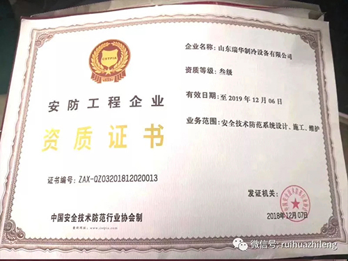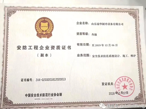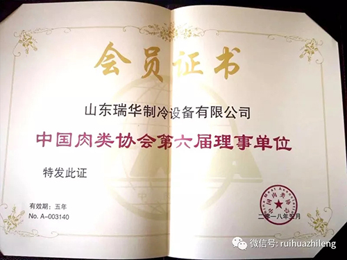 近日,瑞華制冷再獲兩項殊榮,中國肉類協(xié)會第六屆理事單位、張總?cè)沃袊忸悈f(xié)會第六屆理事。同時瑞華制冷通過考核,獲得中國安全技術(shù)防范行業(yè)協(xié)會頒發(fā)的安防工程企業(yè)資質(zhì)證書,涉及制冷行業(yè)范圍內(nèi)的安全技術(shù)防范體系設(shè)計、施工及維護。