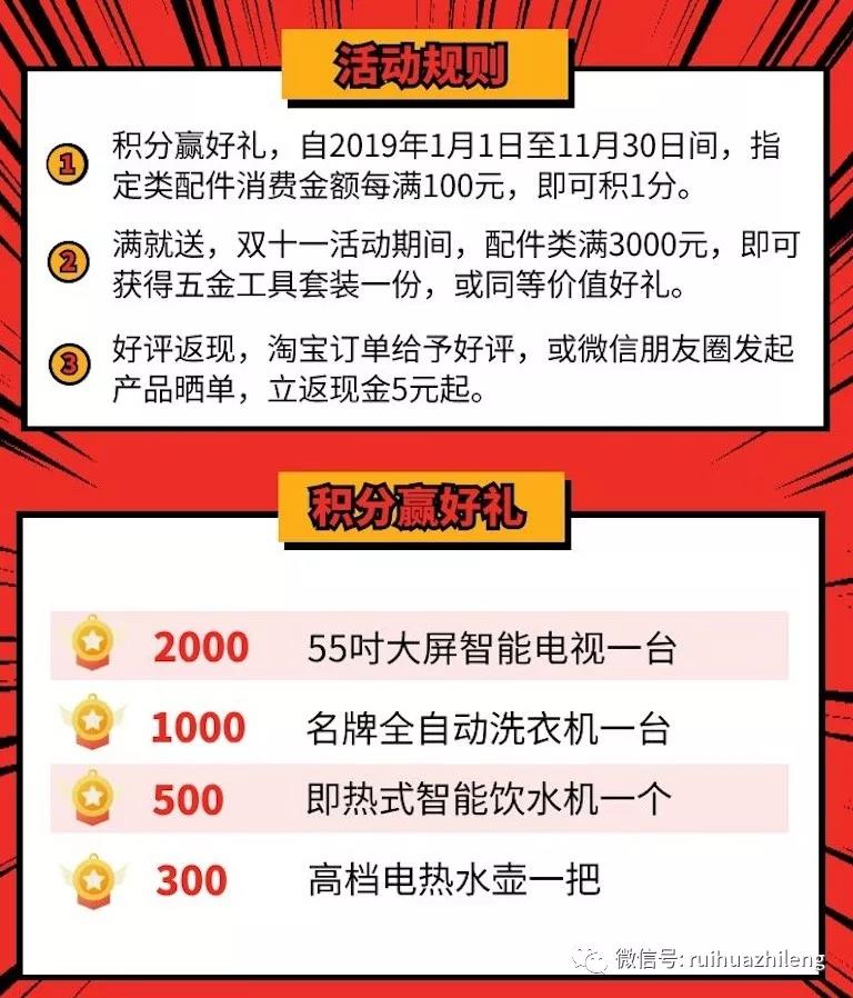 2. 滿就送,雙十一活動(dòng)期間,配件類滿3000元,即可獲得五金工具套裝一份,或同等價(jià)值好禮。